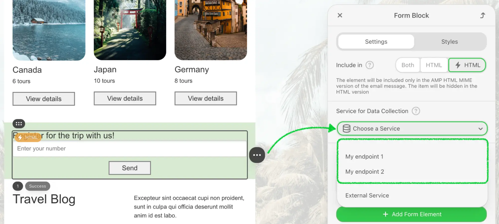 When they drop an AMP Form block into the template, the settings panel displays those endpoints as selectable options.