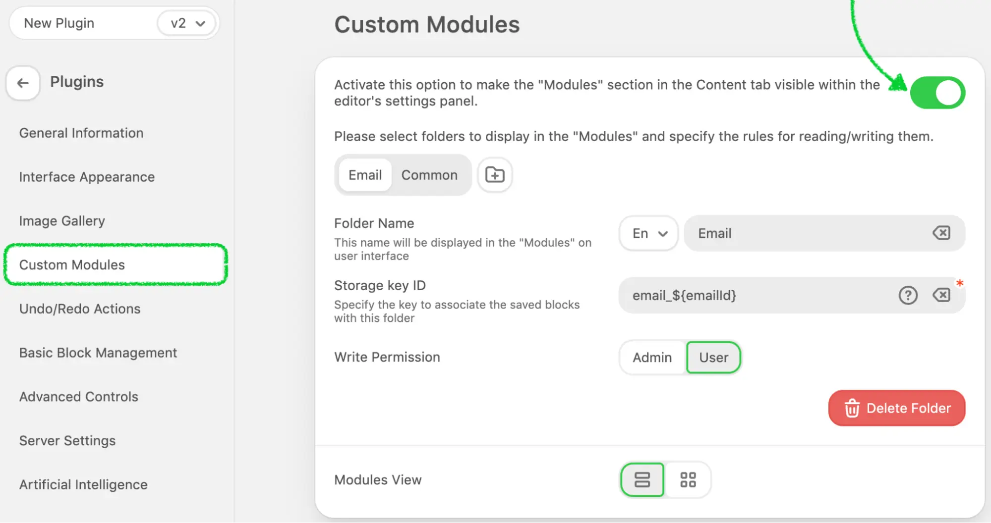 Before users can save and reuse modules, the feature must be activated in your Plugin configuration.