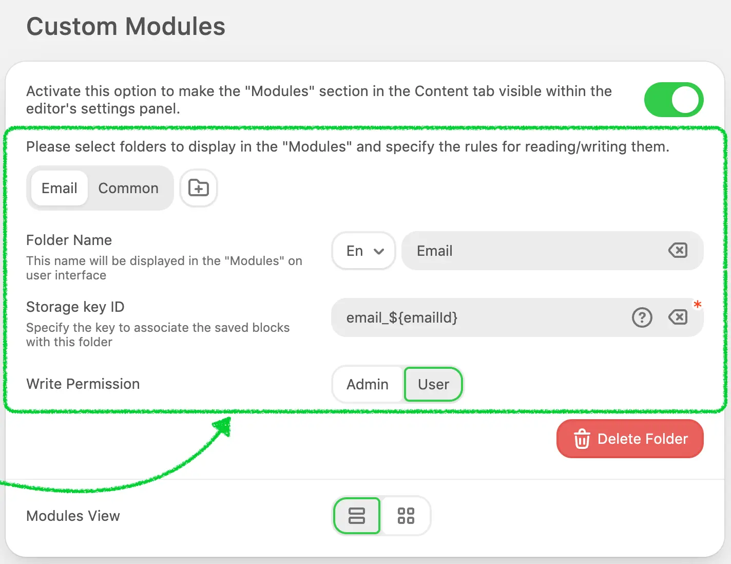 - Write permissions: define which user role has permission not only to view and use modules from this folder but also to create, edit, or delete them.