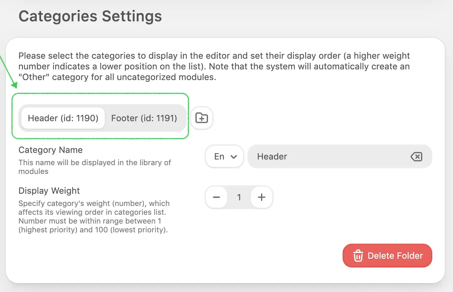 You can create any number of categories to group modules by theme, purpose, or department — for example, Headers, Footers, Promotions, or Transactional.
