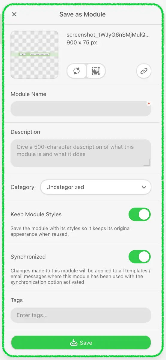 - Enter tags. The "Tags" field lets you group saved modules by tag. You can add one or several tags. Then, choosing the modules, you will see that your modules are grouped by tags;