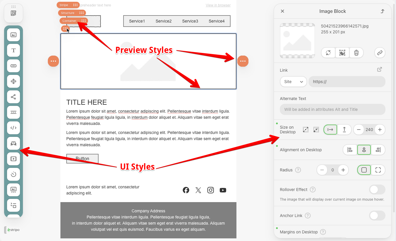 The Stripo Extensions SDK provides comprehensive theming capabilities that allow you to customize the visual appearance of both the editor interface and the email template preview. This includes styling blocks panels, overriding default UI styles, and adding custom preview-only styles like selection borders and context icons.